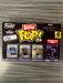 -Bitty Pops! are packaged in hard acrylic cases with detachable bottom lids. Detachable bottom lids double as acrylic bases, to which the Bitty Pop! figures are adhered. Sort and arrange your Bitty Pops! with the included display case! Acrylic display cases are stackable and hold four Bitty Pop! figures each. Vinyl figures are approximately 0.9-inches tall. Four figures per single package purchase.